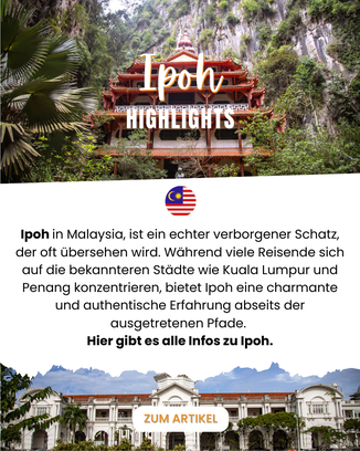 Auf deinem Weg nach Norden machst du Halt in Ipoh, einer unterschätzten Stadt, die mit einzigartigen Tempeln und köstlicher Küche überrascht. Berühmt ist Ipoh vor allem für seine Höhlentempel, die spektakulär in die Kalksteinfelsen gebaut sind. Der Kek Lok Tong beeindruckt mit einer riesigen Höhlenhalle und einem idyllischen Garten, während dich der Perak Cave Temple mit bunten Wandmalereien und einem Ausblick über die Stadt belohnt. Auch Sam Poh Tong zählt zu den ältesten Tempeln des Landes. In der charmanten Altstadt findest du koloniale Bauten, kleine Cafés und moderne Street Art. Kulinarisch darfst du dir das berühmte „Bean Sprout Chicken“ sowie den bekannten Ipoh White Coffeenicht entgehen lassen.