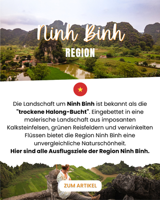 Ninh Binh wird oft als „Halong Bucht auf dem Land“ bezeichnet. Die Region besticht durch malerische Flüsse, Kalksteinfelsen, Reisfelder und historische Tempel. Mit vier Tagen habt ihr genug Zeit für entspannte Bootstouren durch die Flusslandschaften von Tam Coc, Fahrradtouren durch die Dörfer und den Besuch von Trang An oder der Bich Dong Pagode. Ninh Binh ist die ideale Mischung aus Natur, Kultur und Ruhe.